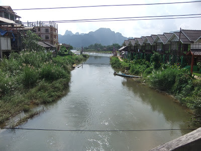 Two seats over the overhead air conditioning system started leaking onto the passengers below. A slow consistent drip turned into a steady stream of water pouring down on them. Two Dutch passengers sat with plastic bags to catch the water for quite some time, until it became too much. They spoke with the driver and had him attempt to turn of the A/C in the back left of the bus. Now we were sitting at the right back side of the bus (2 seats from the leaking roof), and directly above the OTHER A/C. I was sure that with the added work the lone A/C would have to do; that we’d be the next one to be leaked on (sounds gross doesn’t it), but I am happy to say that we got through the trip drip free. The drive was frightening, the roads were pot hole ridden, and our sandwiches made the previous night had been attacked by ants, leaving them inedible. Lovvvvvvvvely. Mark read away throughout the trip, I sat for the majority with my eyes covered, and as the time was upon us when we were to arrive we started wondering when we actually might get in. It was 3:30pm, and still we were not at our destination, and we still hadn’t had our free lunch. At that point the bus pulled over and we unloaded to have a rather late lunch of noodle soup. Not the worst soup in the world, just don’t love the fish balls that they put in everything. So finally about an hour after lunch we arrived to Vang Vieng. We hopped into a tuk-tuk for the main part of town.